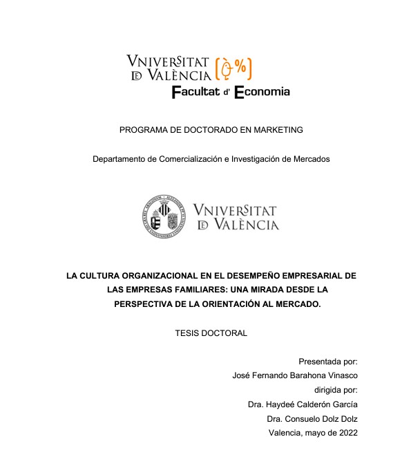 La cultura organizaciónal en el desempeño empresarial de las empresas familiares: una mirada desde la perspectiva de la orientación al mercado. Tesis de José Fernando Barahona Vinasco. Universitat de València 2022.