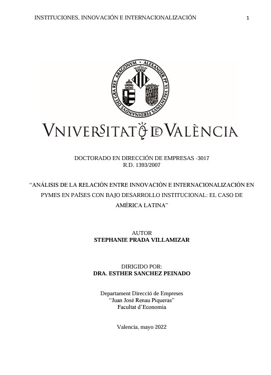 Análisis de la relación entre innovación e internacionalización en pymes en países con bajo desarrollo institucional: el caso de América Latina. Stephani Prada Villamizar. 2022.