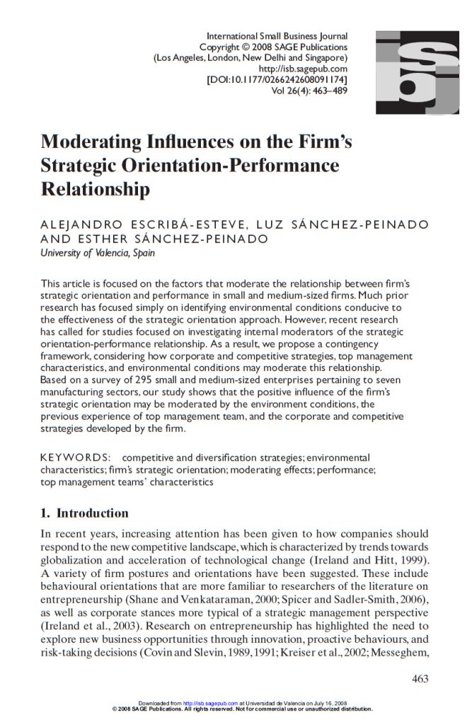 Escribá-Esteve A., Sánchez-Peinado L., Sánchez-Peinado E. 2008. Moderating influences on the firm’s strategic orientation-performance relationship, International Small Business Journal, 264463489