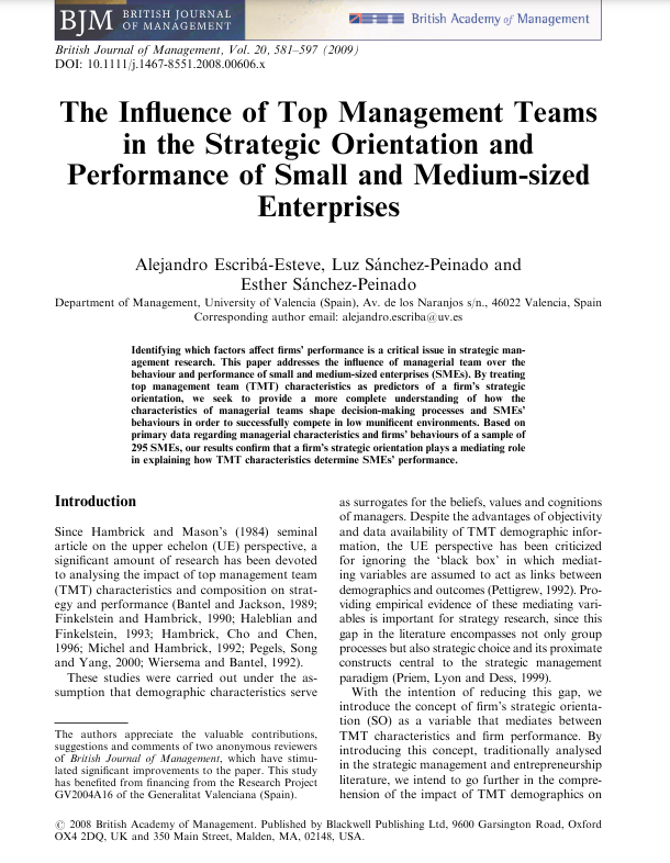 Escribá-Esteve A., Sánchez-Peinado L., Sánchez-Peinado E. 2009. The influence of top management teams in the strategic orientation and performance of small and medium-sized enterprises, British Journal of Management, 204581597