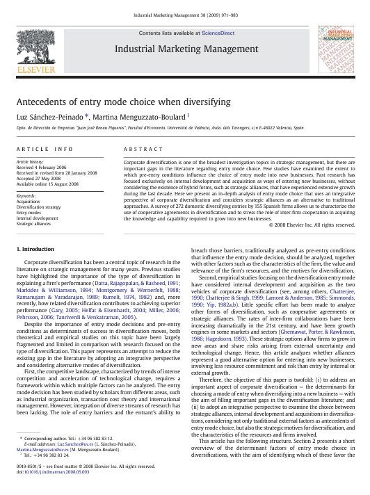 Sánchez-Peinado L., Menguzzato-Boulard M. 2009. Antecedents of entry mode choice when diversifying, Industrial Marketing Management, 388971983