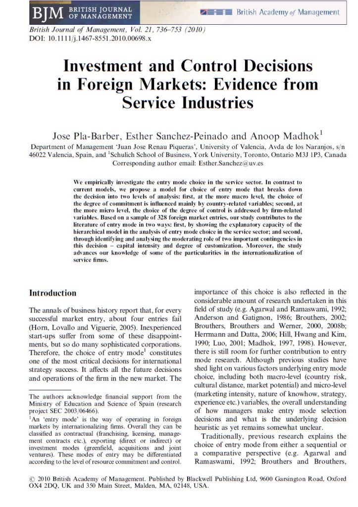 Pla-Barber J., Sanchez-Peinado E., Madhok A. 2010. Investment and control decisions in foreign markets: Evidence from service industries, British Journal of Management, 213736753