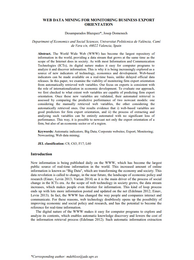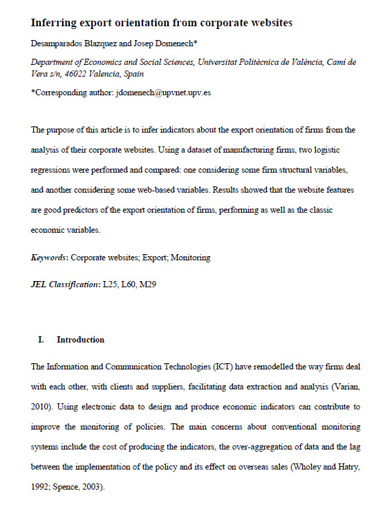 Blazquez D., Domenech J. 2014. Inferring export orientation from corporate websites, Applied Economics Letters, 217509512