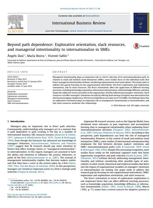 Dasí T., Iborra M., Safón V. 2015. Beyond path dependence: Explorative orientation, slack resources, and managerial intentionality to internationalize in SMEs, International Business Review, 24 (1): 77-88.