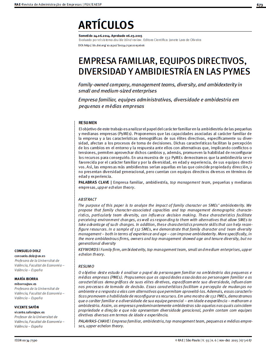 Dolz C., Iborra M., Safón V. 2015. Family-owned company, Management teams, Diversity, And ambidexterity in small and medium-sized enterprises [Empresa familiar, Equipos directivos, Diversidad y ambidiestría en las pymes], RAE Revista de Administracao de Empresas, 55 (6) : 673-687.