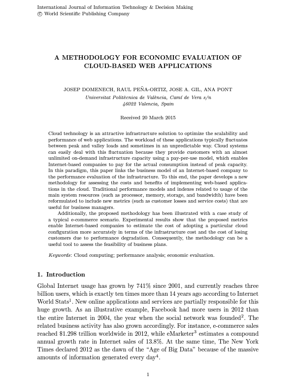 Domenech J., Peña-Ortiz R., Gil J.A., Pont A. 2016. A Methodology for Economic Evaluation of Cloud-Based Web Applications, International Journal of Information Technology and Decision Making, 15615551578