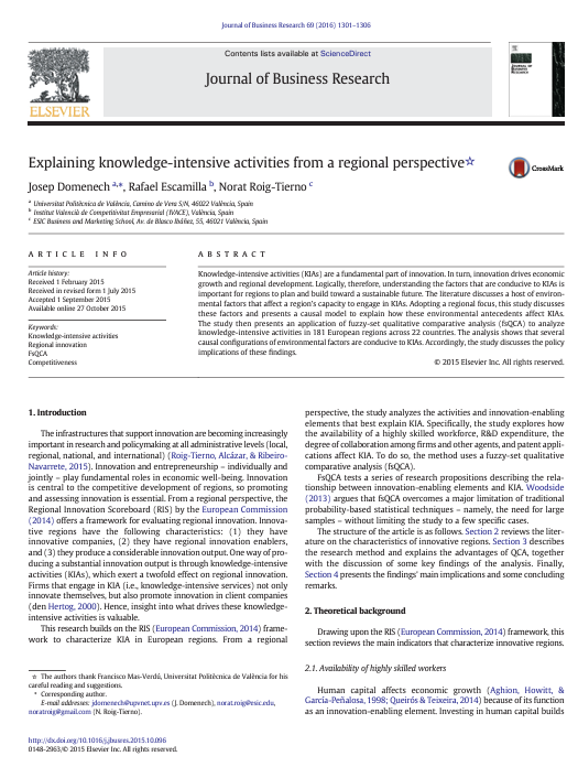 Domenech J., Escamilla R., Roig-Tierno N. 2016. Explaining knowledge-intensive activities from a regional perspective, Journal of Business Research, 69413011306
