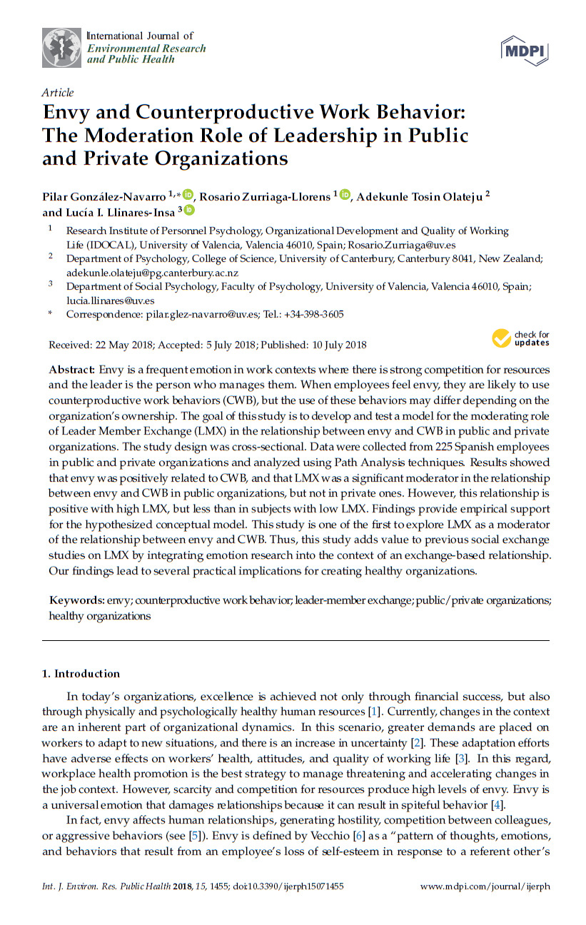 González-Navarro P., Zurriaga-Llorens R., Olateju A.T., Llinares-Insa L.I. 2018. Envy and counterproductive work behavior: The moderation role of leadership in public and private organizations, International Journal of Environmental Research and Public Health, 1571455