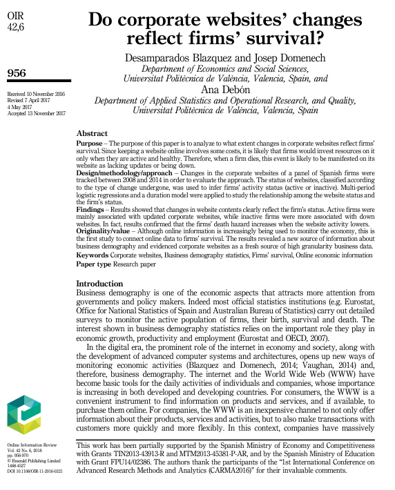 Blazquez D., Domenech J., Debón A. 2018. Do corporate websites’ changes reflect firms’ survival?, Online Information Review, 426956970