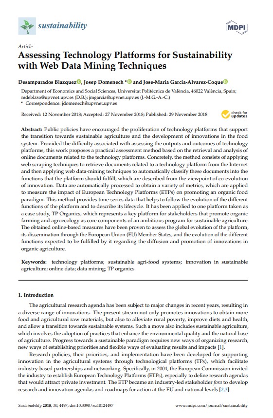 Blazquez D., Domenech J., Garcia-Alvarez-Coque J.-M. 2018. Assessing technology platforms for sustainability with web data mining techniques, Sustainability (Switzerland), 10124497
