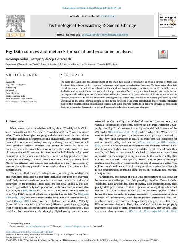 Blazquez D., Domenech J. 2018. Big Data sources and methods for social and economic analyses, Technological Forecasting and Social Change, 13099113