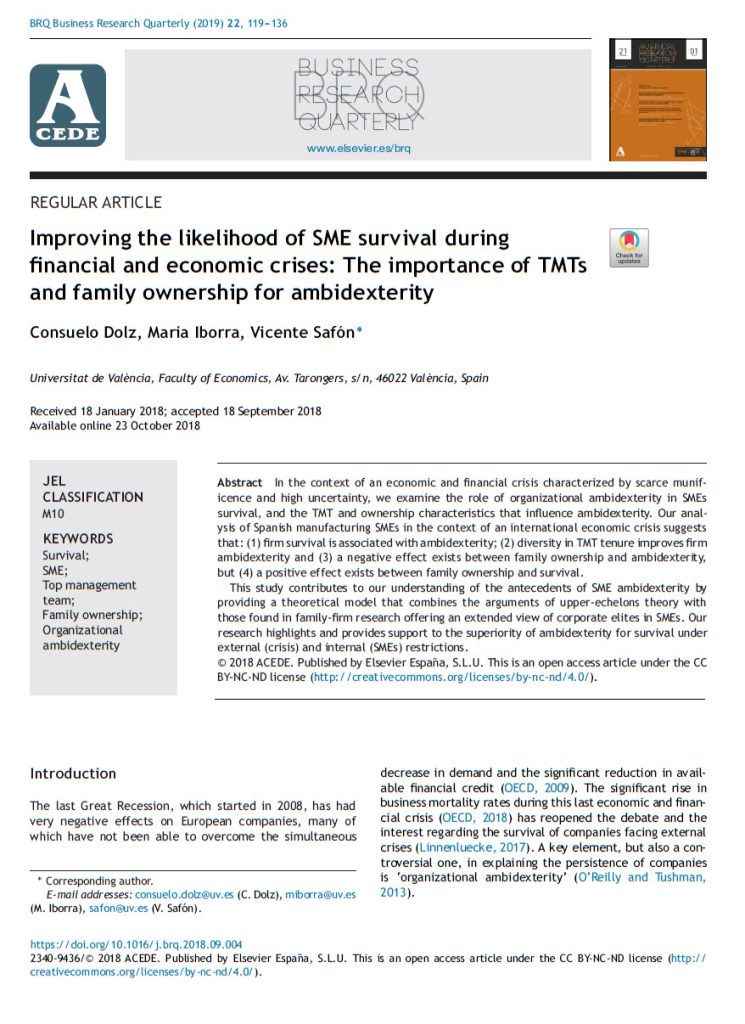 Dolz C., Iborra M., Safón V. 2019. Improving the likelihood of SME survival during financial and economic crises: The importance of TMTs and family ownership for ambidexterity, BRQ Business Research Quarterly,22 (2): 119-136.
