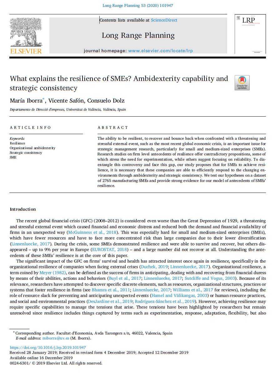 Iborra M., Safón V., Dolz C. 2020. What explains the resilience of SMEs? Ambidexterity capability and strategic consistency, Long Range Planning,53 (6), 101947.