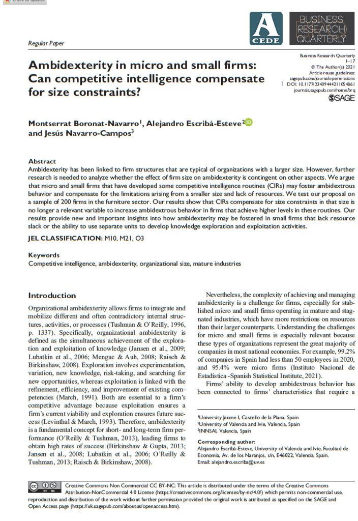 Boronat-Navarro, M., Escribá-Esteve, A., & Navarro-Campos, J. 2021. Ambidexterity in micro and small firms: Can competitive intelligence compensate for size constraints?. BRQ Business Research Quarterly, 23409444211054861.