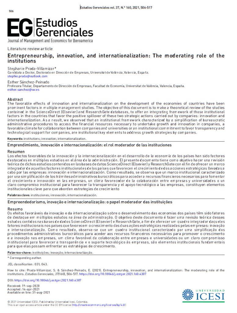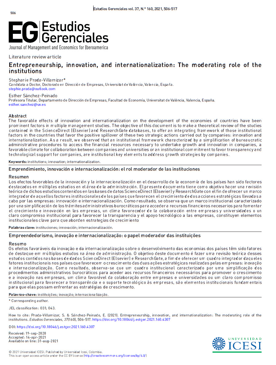 Prada-Villamizar S., Sánchez-Peinado E. 2021. Entrepreneurship, innovation, and internationalization: The moderating role of the institutions [Empreendedorismo, inovação e internacionalização: O papel moderador das instituições] [Emprendimiento, innovación e internacionalización: El rol moderador de las instituciones], Estudios Gerenciales, 37160506517