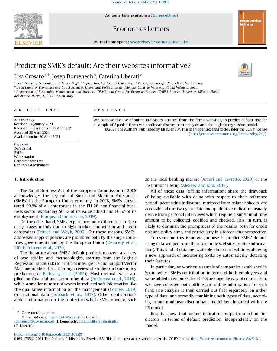 Crosato L., Domenech J., Liberati C.2021Predicting SME’s default: Are their websites informative?, Economics Letters, 204109888