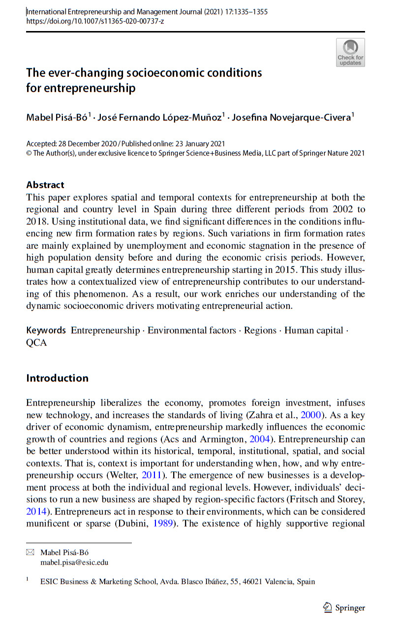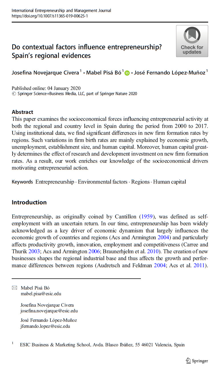 Novejarque Civera J., Pisá Bó M., López-Muñoz J.F. 2021. Do contextual factors influence entrepreneurship? Spain’s regional evidences, International Entrepreneurship and Management Journal, 171105129