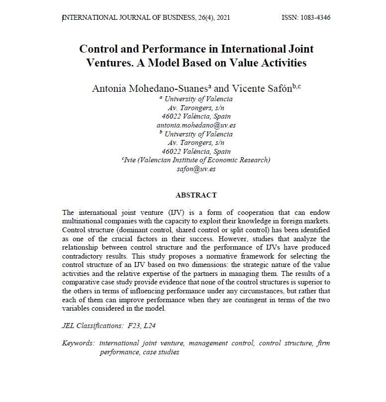 Mohedano-Suanes, A., & Safón, V. 2021. Control and Performance in International Joint Ventures. A Model Based on Value Activities. International Journal of Business, 26(4), 20-45.