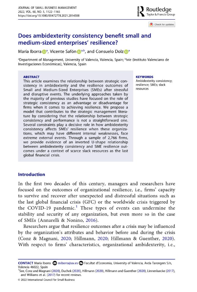 Iborra, M., Safón, V., & Dolz, C.2022. Does ambidexterity consistency benefit small and medium-sized enterprises’ resilience? Journal of Small Business Management, 60(5): 1122–1165.