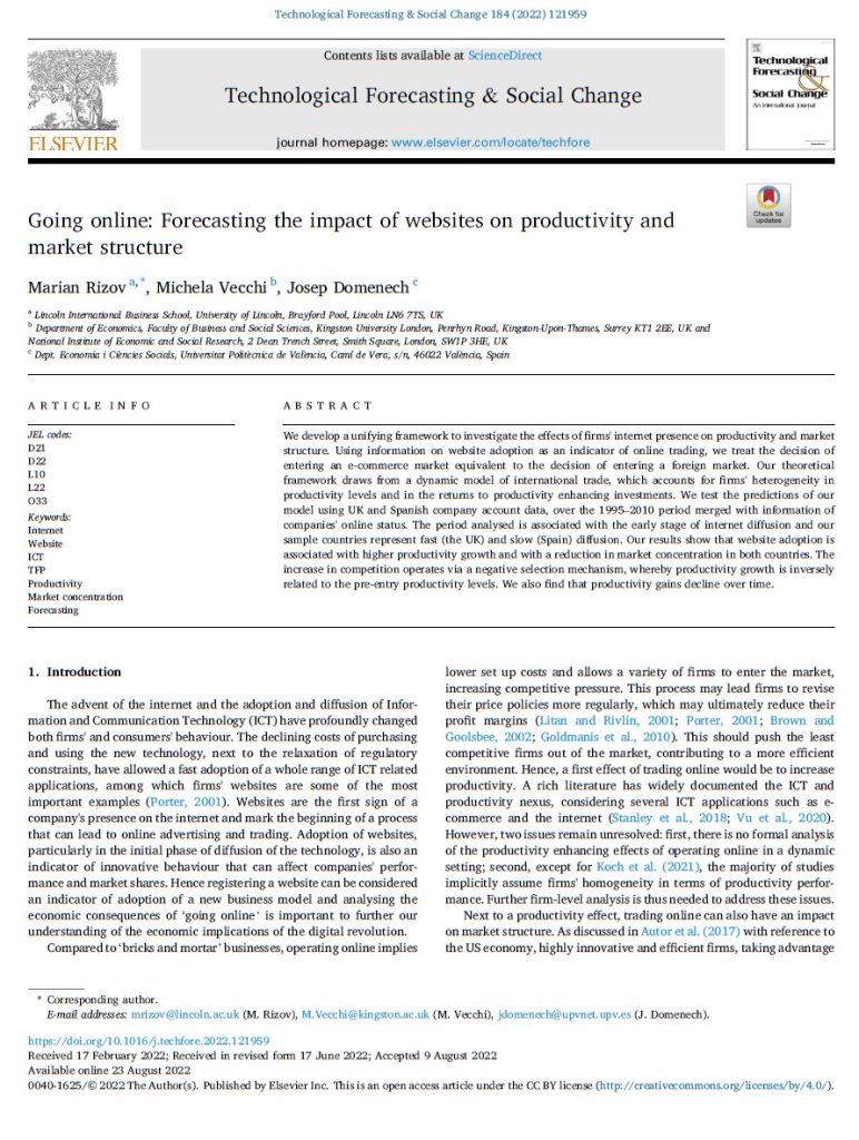 Rizov M., Vecchi M., Domenech J. 2022. Going online: Forecasting the impact of websites on productivity and market structure, Technological Forecasting and Social Change, 184121959