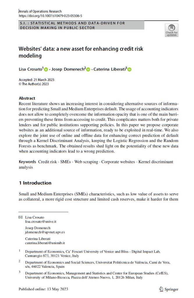 Crosato L., Domenech J., Liberati C. 2023. Websites’ data: a new asset for enhancing credit risk modeling, Annals of Operations Research