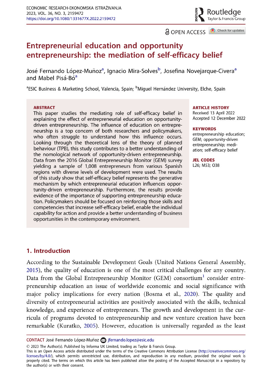 López-Muñoz J.F., Mira-Solves I., Novejarque-Civera J., Pisá-Bó M. 2023. Entrepreneurial education and opportunity entrepreneurship: the mediation of self-efficacy belief, Economic Research-Ekonomska Istrazivanja 3632159472