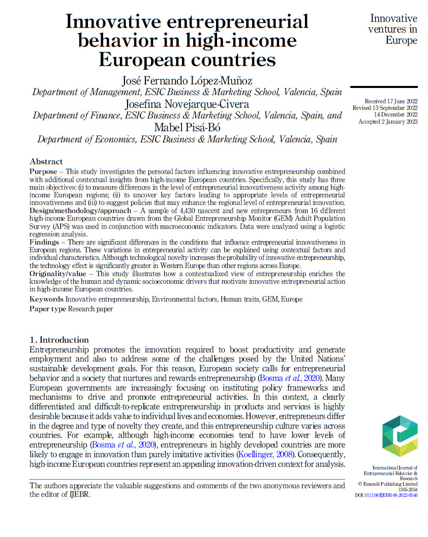 López-Muñoz J.F., Novejarque-Civera J., Pisá-Bó M. 2023. Innovative entrepreneurial behavior in high-income European countries, International Journal of Entrepreneurial Behaviour and Research, 29715161540