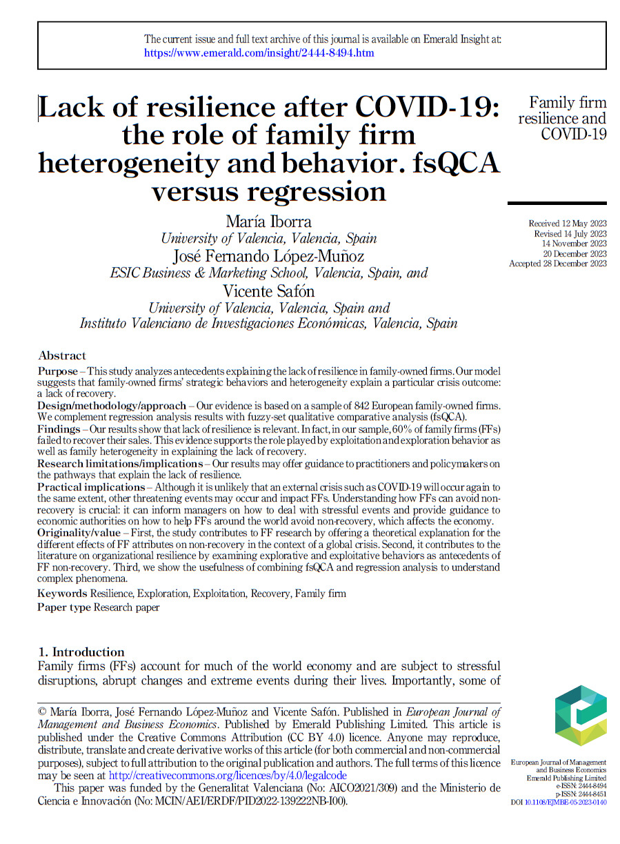 Iborra, M.; López-Muñoz, J. F.; Safón, V. 2024. Lack of resilience after covid-19: the role of family firm heterogeneity and behavior. fsQCA versus regression. European Journal of Management and Business Economics.