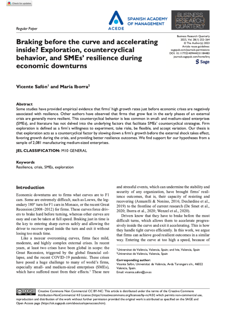 Safón, V., & Iborra, M. (2025). Braking before the curve and accelerating inside? Exploration, countercyclical behavior, and SMEs’ resilience during economic downturns. BRQ Business Research Quarterly28(1), 252-264.