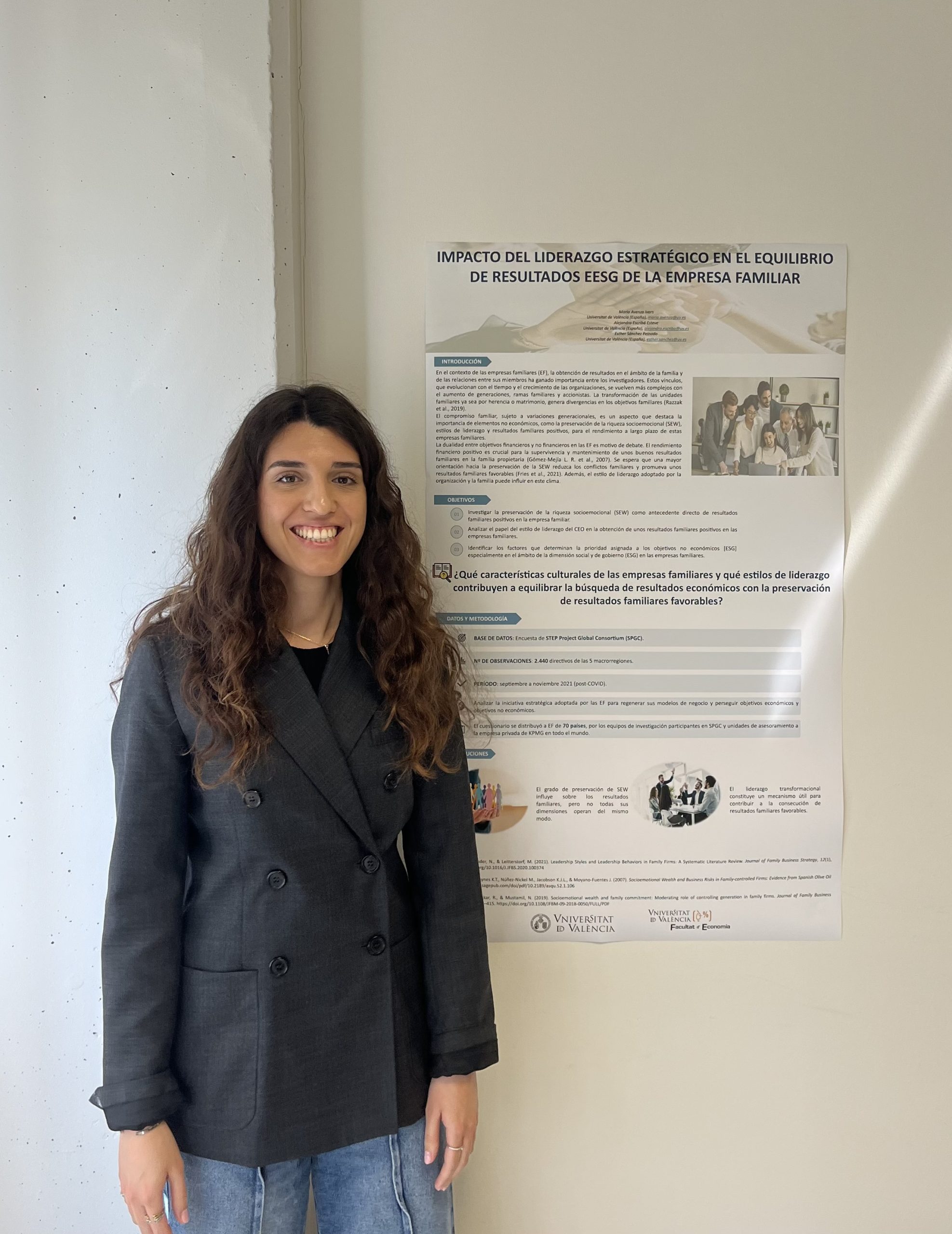 María Avenza, member of the research team, has presented a poster related to her doctoral thesis, entitled ‘Impact of strategic leadership on the balance of EESG results of the family business’, at the II Workshop of Young Researchers of the Department of Business Management ‘Juan José Renau Piqueras’.