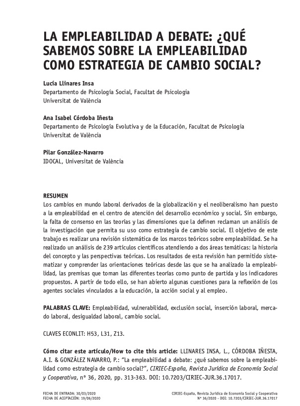 Insa L.L., Iñesta A.I.C., González-Navarro P. 2020. Debate on employability: what do we know about employability as strategy of social change? [la empleabilidad a debate: ¿qué sabemos sobre la empleabilidad como estrategia de cambio social?], CIRIEC-Espana, Revista Juridica de Economia Social y Cooperativa, 202036313363