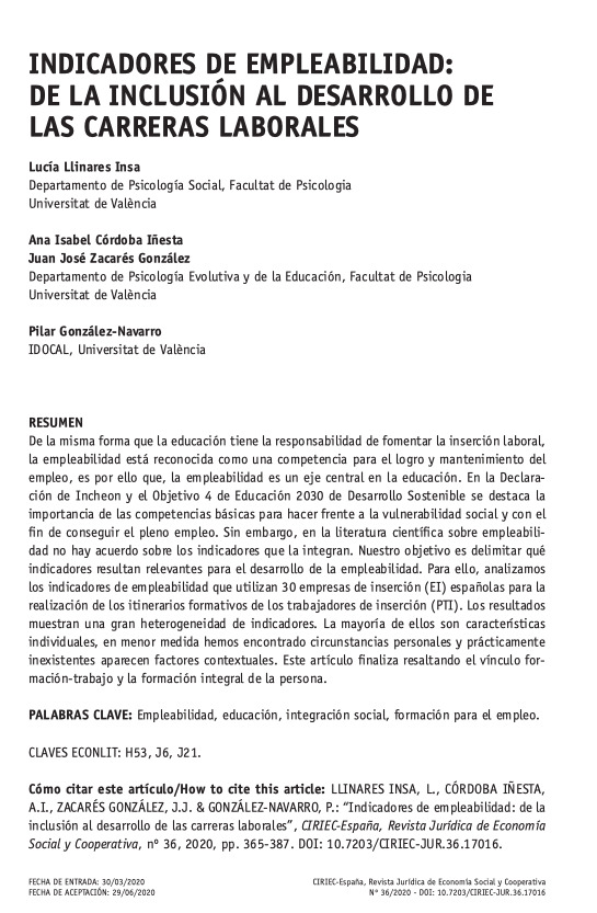 Insa L.L., Iñesta A.I.C., González J.J.Z., González-Navarro P. 2020. Employability indicators: from inclusion to career development [indicadores de empleabilidad: de la inclusión al desarrollo de las carreras laborales], CIRIEC-Espana, Revista Juridica de Economia Social y Cooperativa, 202036365387