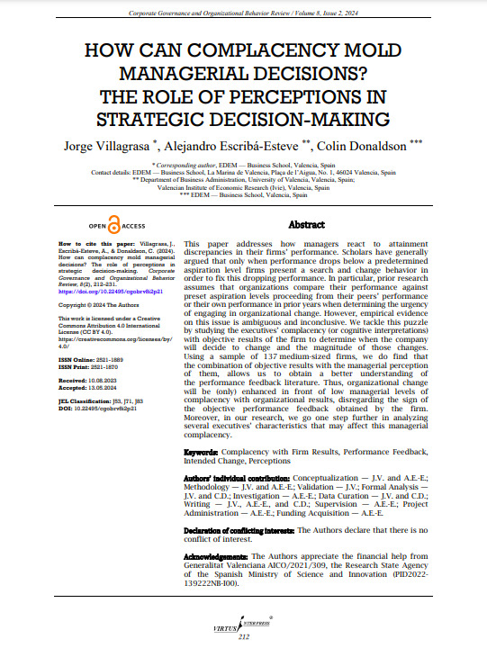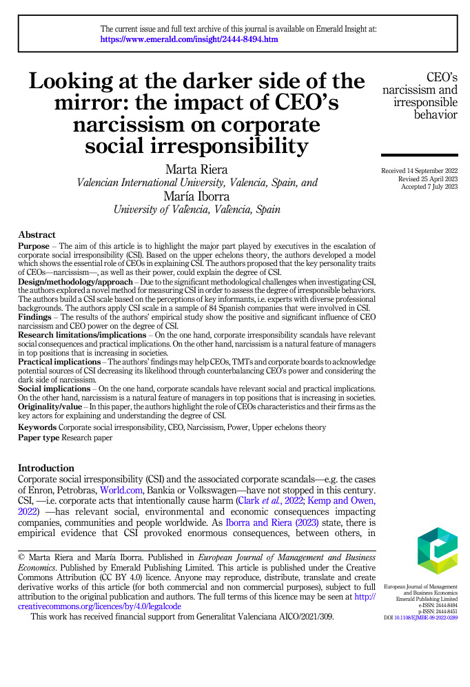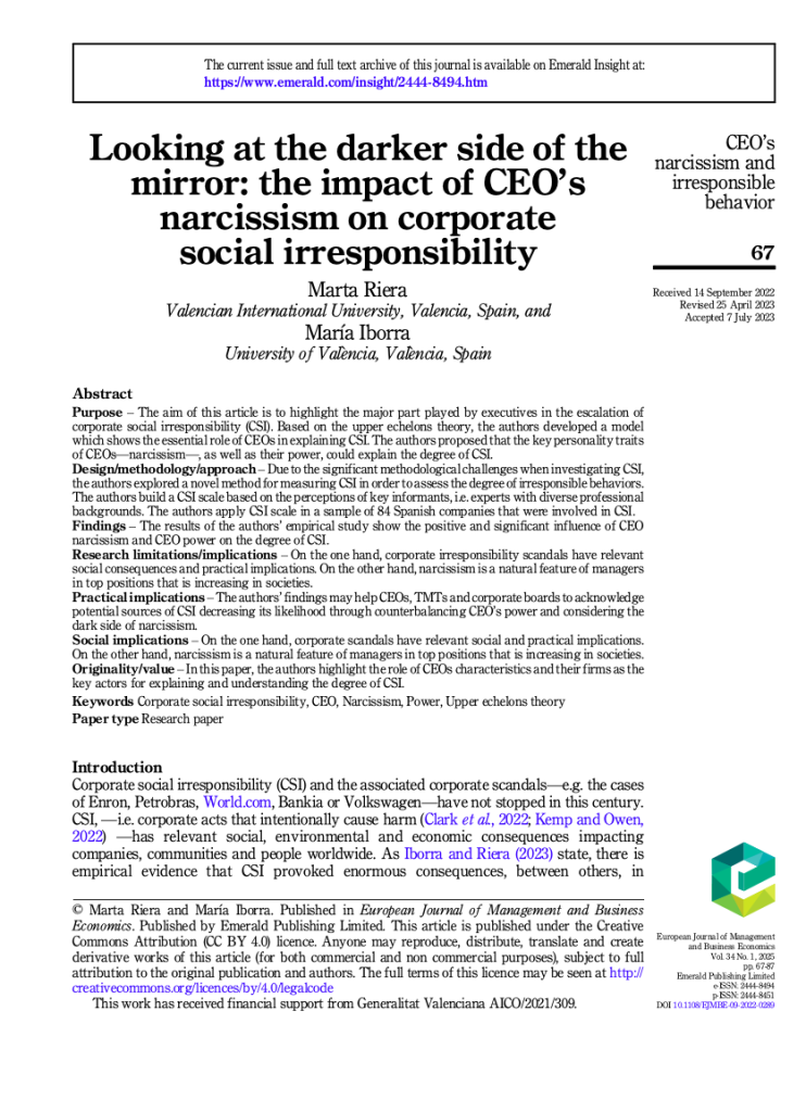 Riera, M., Iborra, M. (2025). Looking at the darker side of the mirror: the impact of CEO’s narcissism on corporate social irresponsibility. European Journal of Management and Business Economics, Vol 34 nº1, pp 67-87.