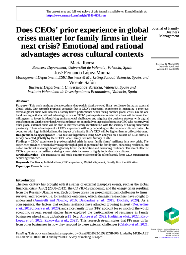 Iborra, M., López-Muñoz, J.F. and Safón, V.(2025), “Does CEOs’ prior experience in global crises matter for family firms in their next crisis? Emotional and rational advantages across cultural contexts”, Journal of Family Business Management, Vol. ahead-of-print No. ahead-of-print.