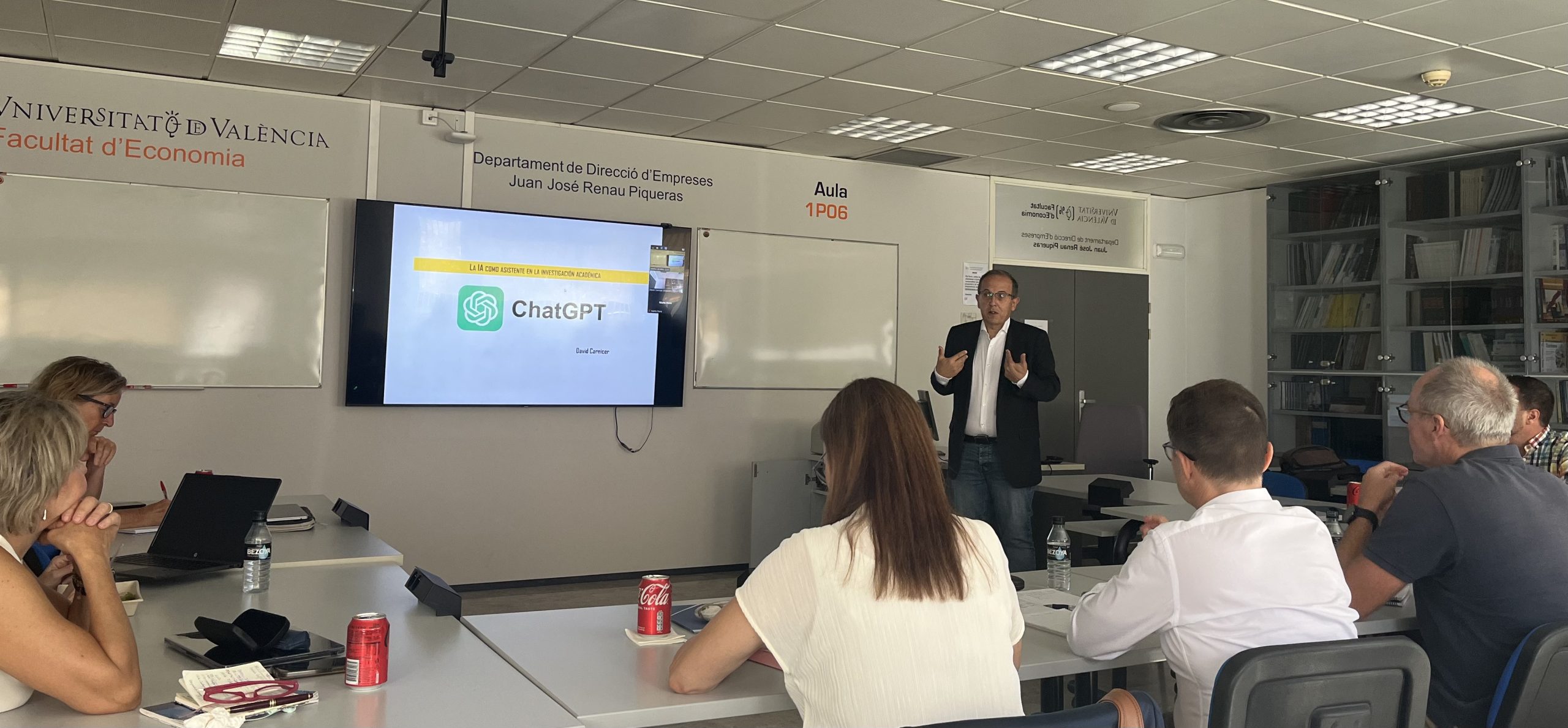 In the first part, the seminar ‘Generative AI as an aid to academic research’, given by Dr. David Carnicer, took place. During the talk, Dr. Carnicer explored how generative AI can facilitate and enhance the work of researchers, opening up new opportunities for data analysis and knowledge creation.