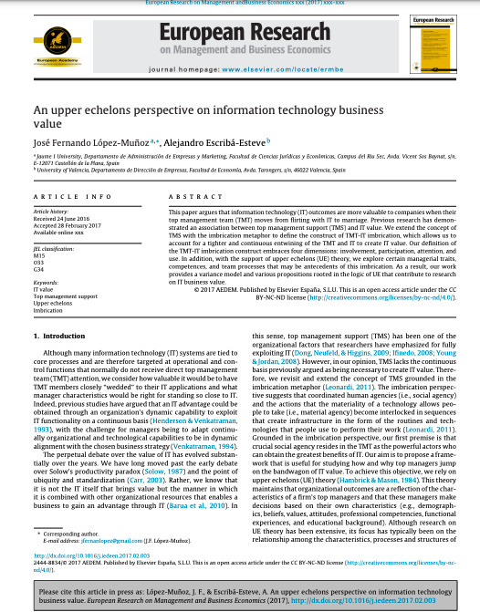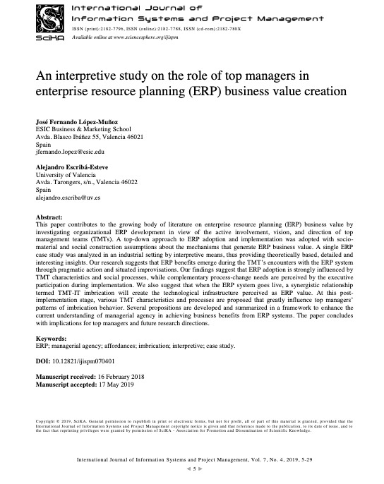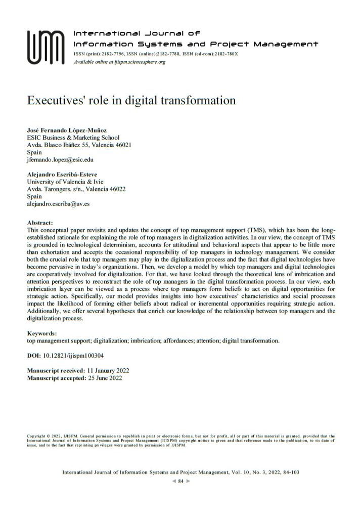 López Muñoz, J.F. & Escribá-Esteve, A. 2022. Executives’ role in digital transformation, International Journal of Information Systems and Project Management, 10 (3): 84-103