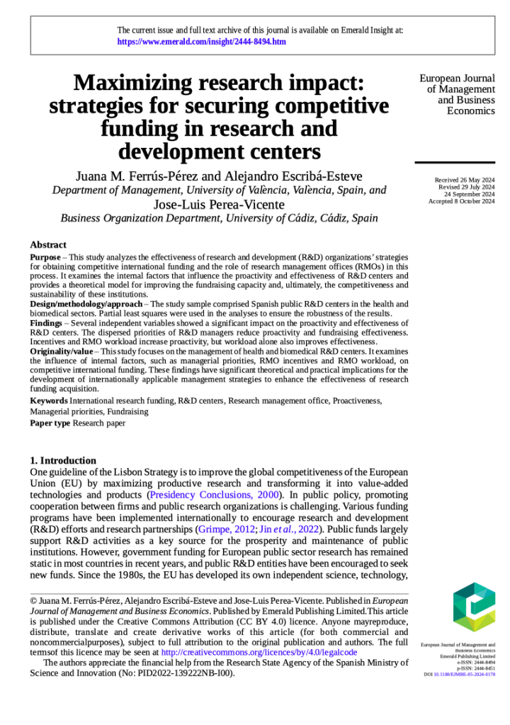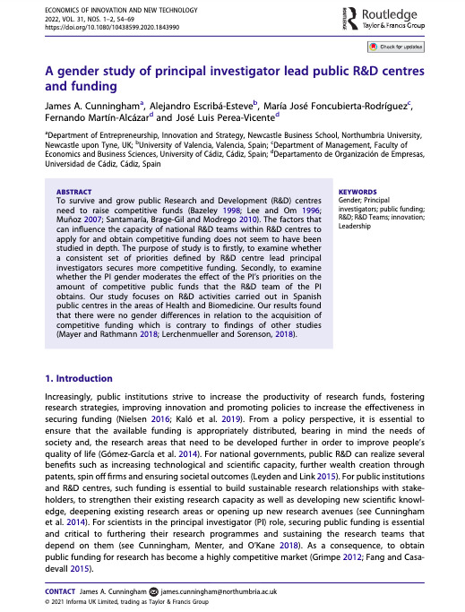 Cunningham, J. A., Escribá-Esteve, A., Foncubierta-Rodríguez, M. J., Martín-Alcázar, F., & Perea-Vicente, J. L. 2022. A gender study of principal investigator lead public R&D centres and funding. Economics of Innovation and New Technology, 31(1-2), 54-69.